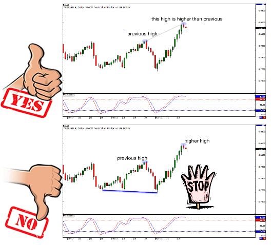 (图1的高点高于之前的高点,这时可以关注背离信号带来的交易机会;而图2明显处于震荡市场中,不适宜运用背离规则)