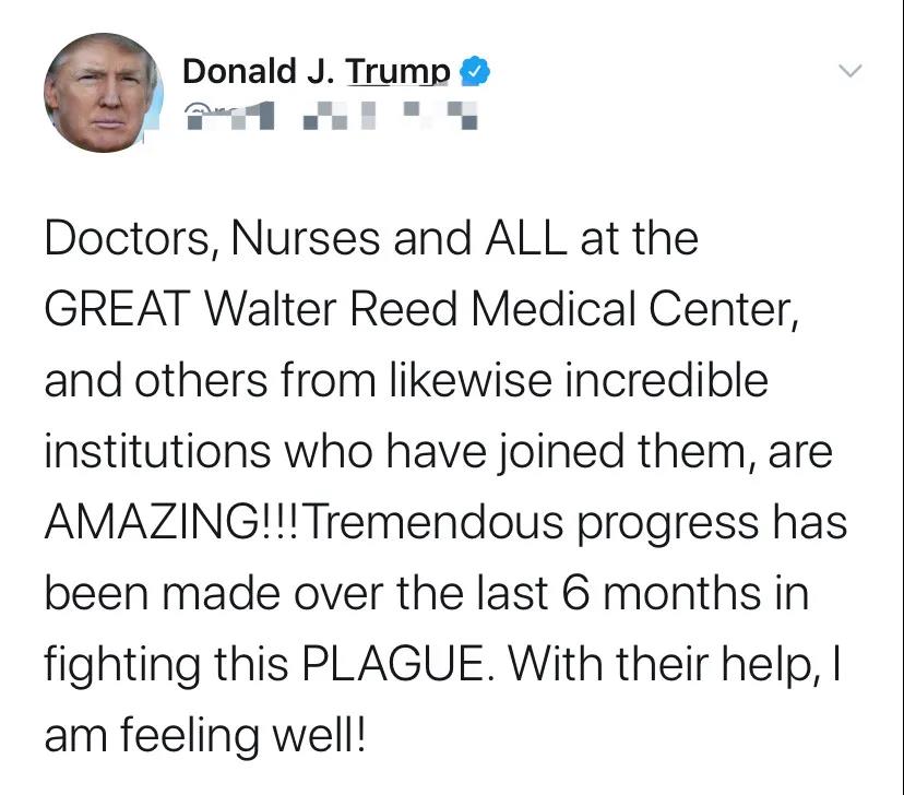 梅多斯的言论登上各大媒体头条后,特朗普大怒,很快他就发了一条推文:“伟大的沃尔特•里德医疗中心的医生,护士和所有人,还有来自其它非常棒的医疗机构的其他人,AMAZING!过去半年战胜这场瘟疫取得了巨大进展。在他们的帮助下,我感觉很好!