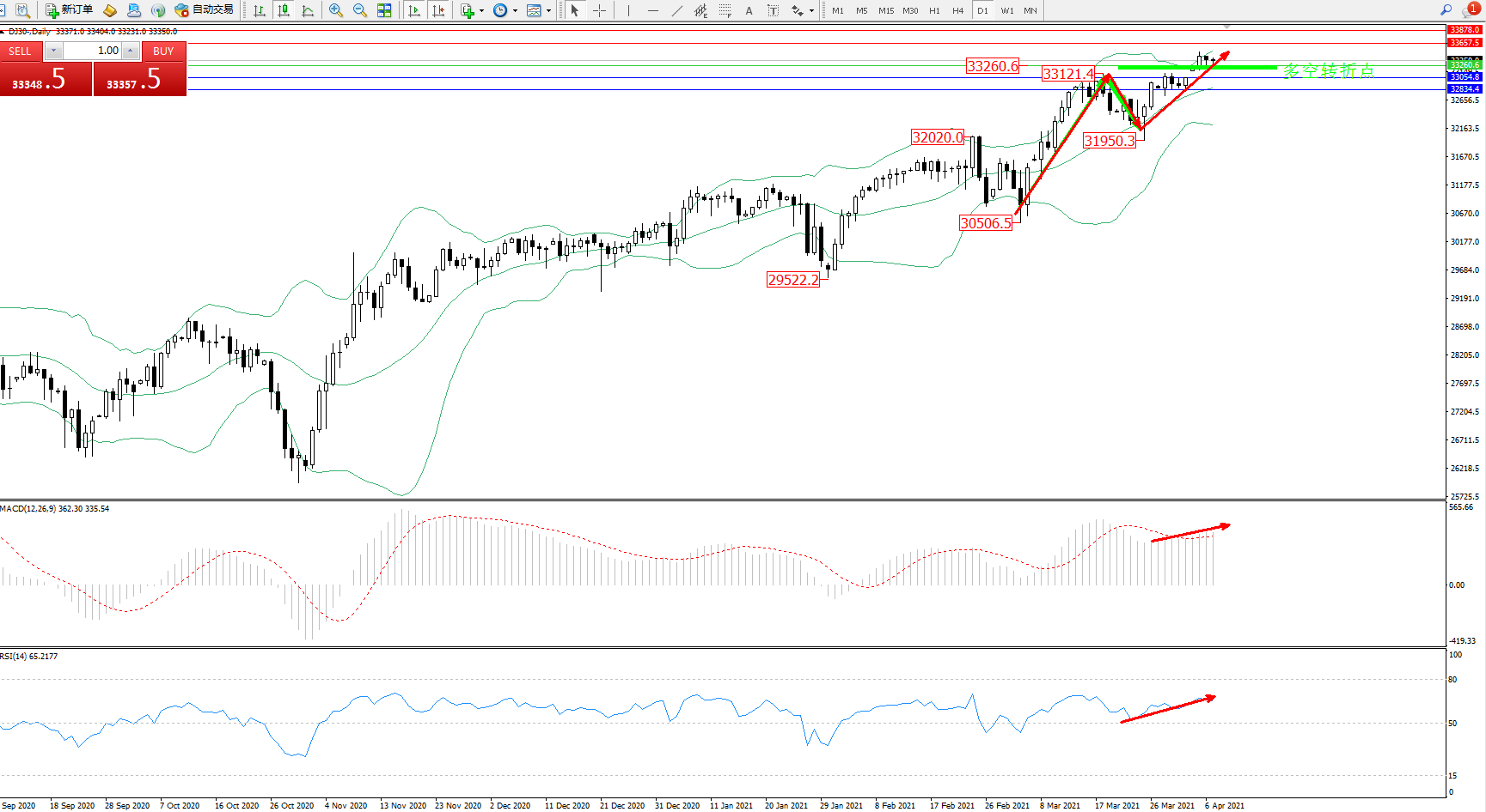 交易策略:33260上方看涨,目标33657、33878