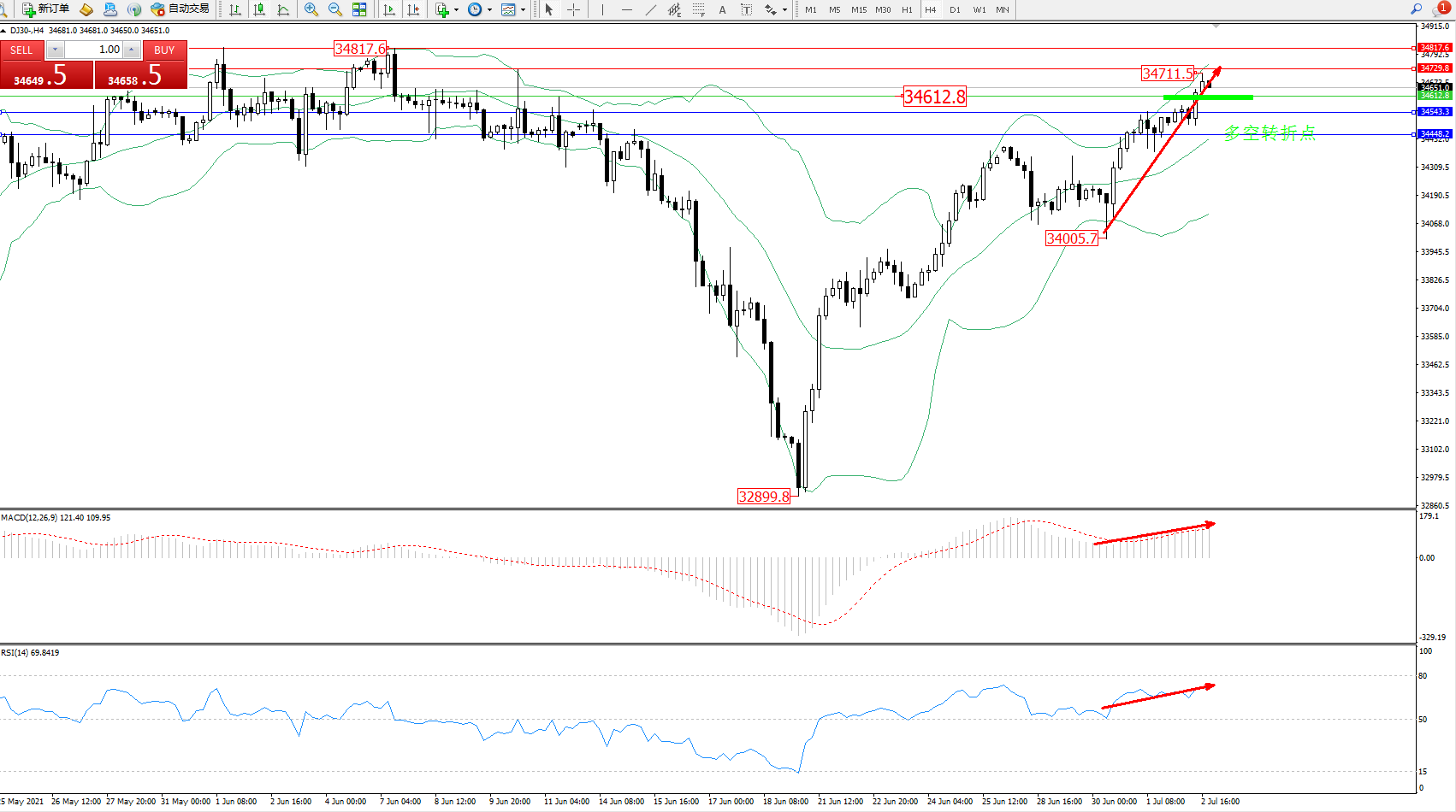 交易策略:34612上方看涨,目标34729、34817