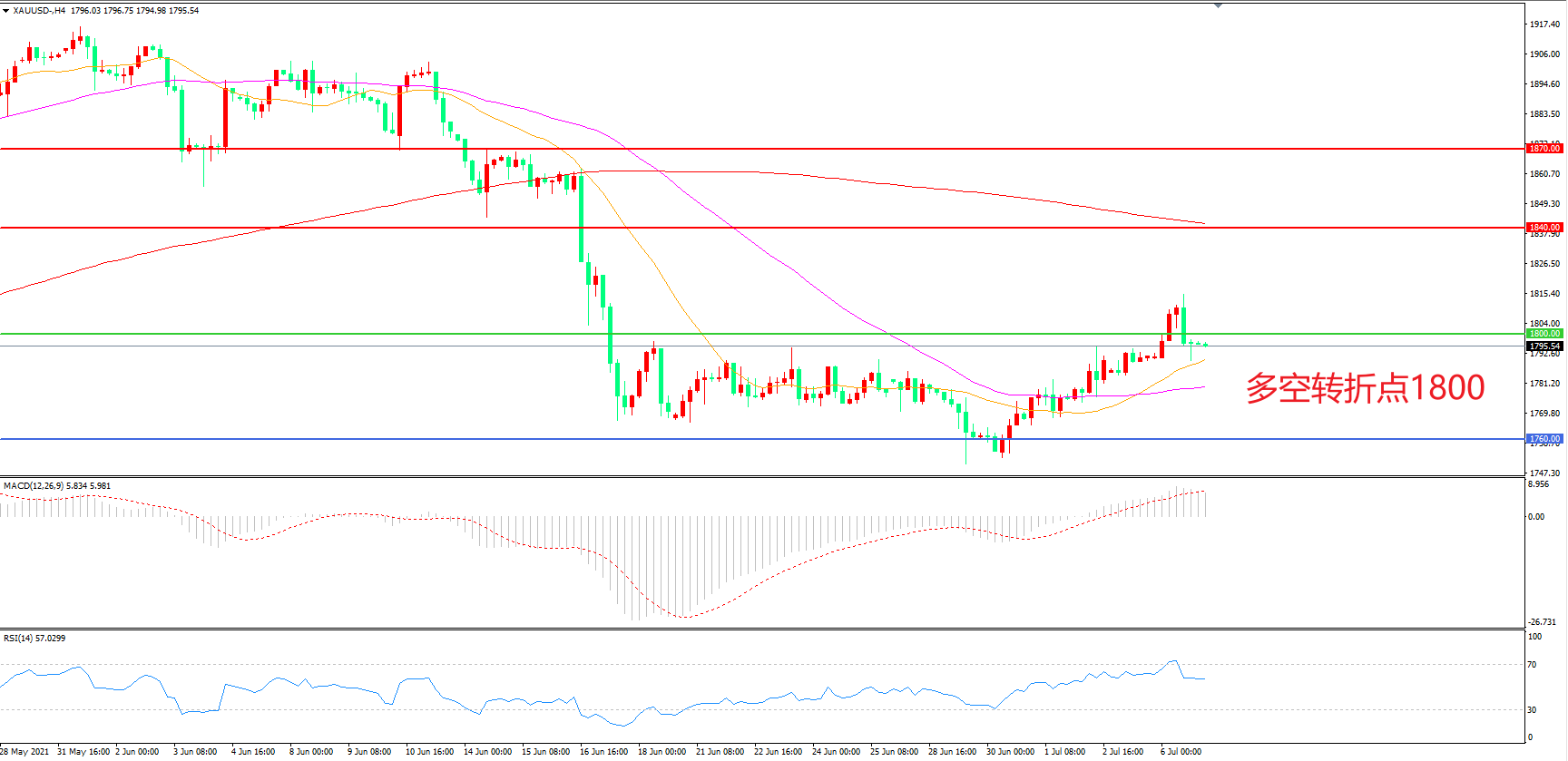 交易策略:  在1800.00之上看涨,目标1840.00       1870.00
