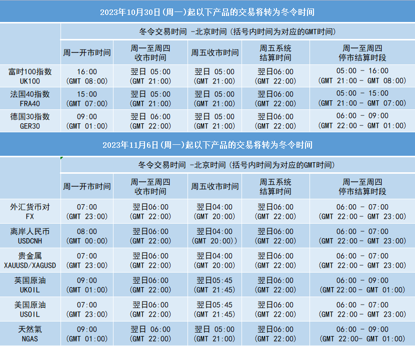 因应欧洲时区于2023年10月29日(周日)及美国时区于2023年11月5日(周日)开始分别转为冬令时间, 本公司各产品交易时间将调整为冬令时间,敬请留意。